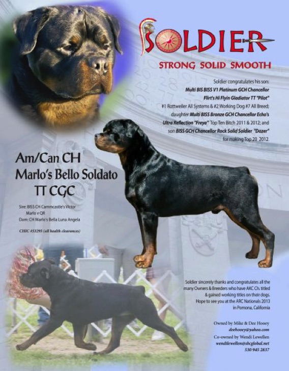 Chancellor Rottweilers Champion Rottweilers for Show with some super quality pets available on occasion. Breeder of over 100 Champions. Health clearances through OFA. Responsible Breeder of Merit. Puppies, Specials, Show and Pet Rottweilers available in Northern California. Transport available. Breeder Owner BOS FCI WORLD Ch; Intl. Ch of Americas; FCI MEX. Ch; AKC CH. IRON BARBIE CHANCELLOR HCT HS TT; & Multi Sieger/BEST OF BREED; BEST PUPPY; YOUTH SIEGER; #1 Stud Dog & Best Kennel Health & Temperament Tested. AKC BREEDER OF MERIT; Honored OFA Ch Orthopedic Foundation Ch Health; Double Platinum Multi BEST IN SHOW; BEST IN Regional SPECIALTIES; American Rottweiler National Specialties; Westminster Multi BOB AND WORKING DOG Group IV. # 1 AKC ROTTWEILER WORKING GROUP; MULTI ALL BREED Top 3 Working USA. Multi Eukanuba National Wins Breeder Owner BOS FCI WORLD Ch; Intl. Ch of Americas; FCI MEX. Ch; AKC CH. IRON BARBIE CHANCELLOR HCT HS TT; & Multi Sieger/BEST OF BREED; BEST PUPPY; YOUTH SIEGER; #1 Stud Dog & Best Kennel Multi Top AKC & ARC producer; Tied for #1 AKC TOP PRODUCER OF YEAR